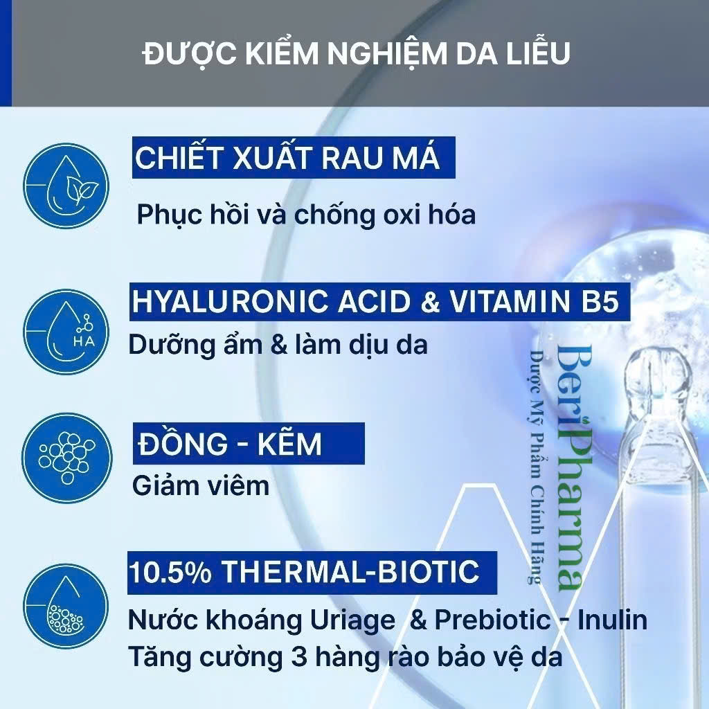 - Cân bằng da: Cải tiến prebiotics mới chứa 10.5% phức hợp thermal-biotic và nước Uriage giúp tái cân bằng da.
